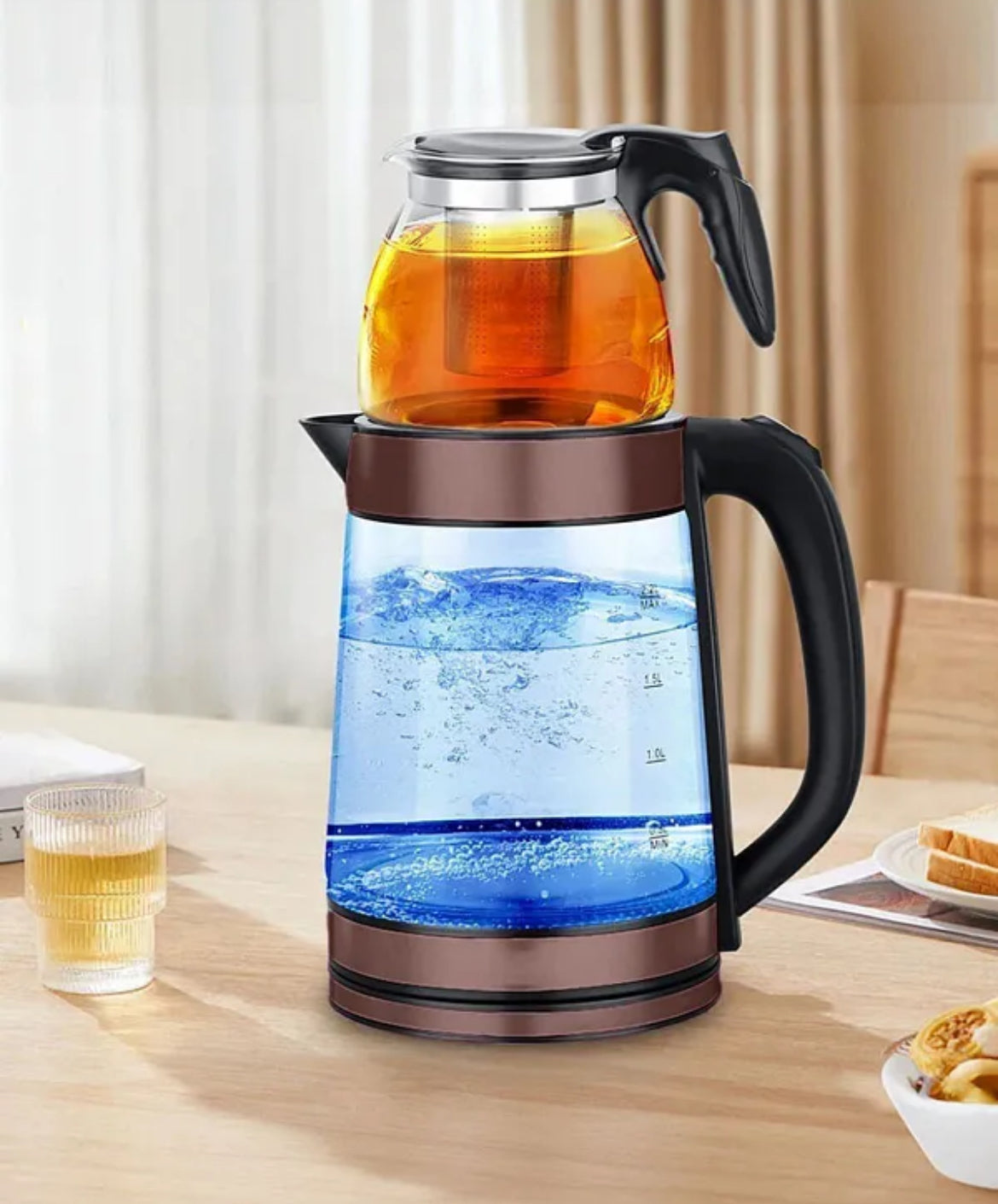 غلاية ماء متعددة الوظائف بسعة 2.0 لتر، مصممة بتصميم زجاجي شفاف مع مؤشرات مستوى الماء ومقبض مريح. الجزء العلوي يحتوي على إبريق صغير للشاي، مما يجعلها مناسبة لتحضير المشروبات الساخنة.