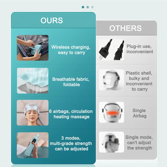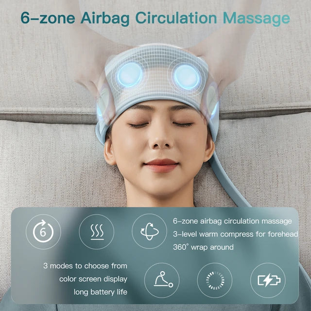 1. تقنية تدليك الهواء الدائري الذكي، بزاوية 360 درجة حول الرأس، مع 6 وسائد هوائية ذكية للتدليك محاكاةً لعمل اليد البشرية بالعجن العميق للاسترخاء.