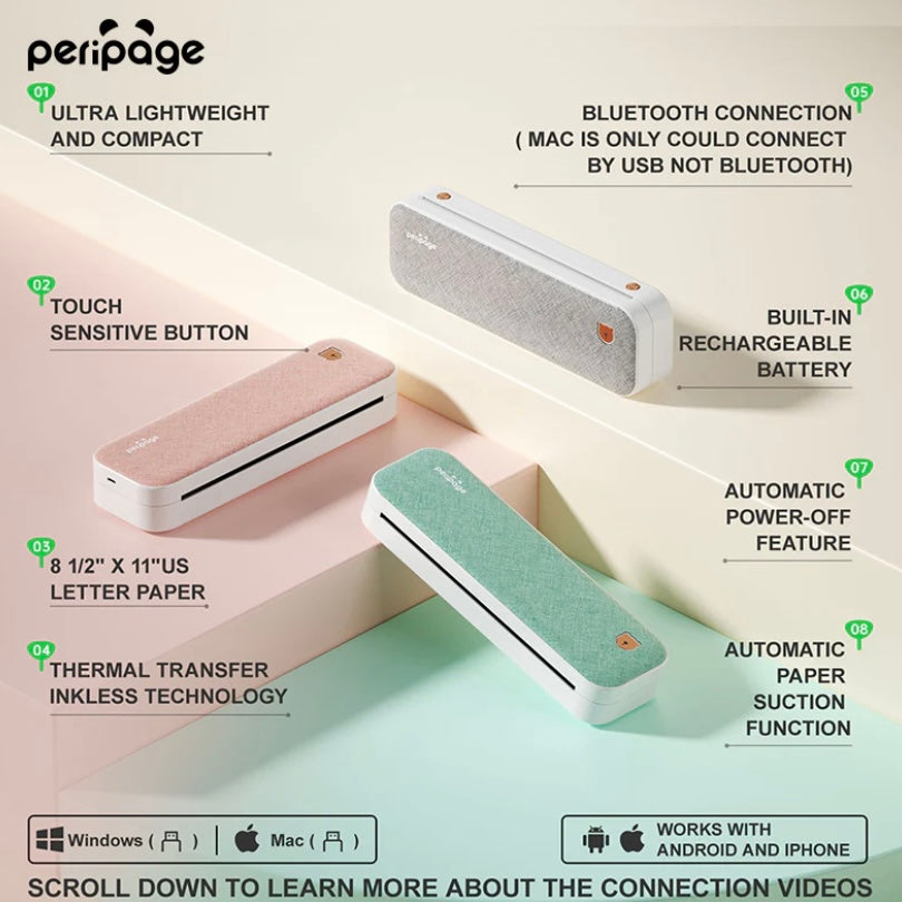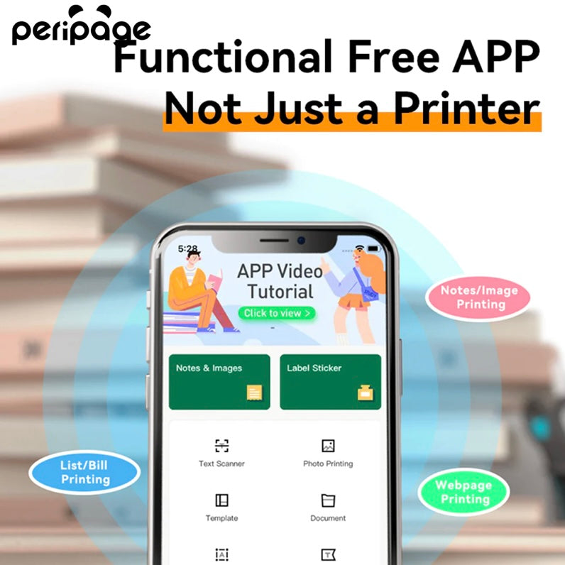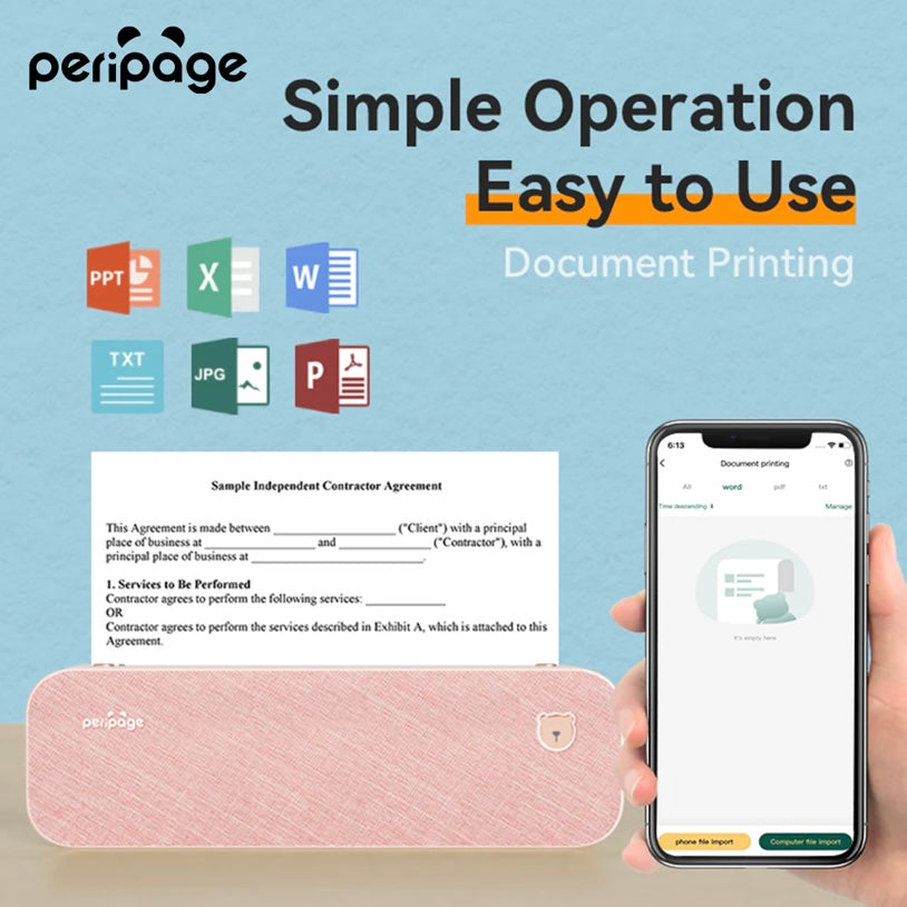 تعتبر طابعة PeriPage A40 متوافقة مع مجموعة متنوعة من الأجهزة مثل الهواتف الذكية والأجهزة اللوحية وأجهزة الكمبيوتر، وذلك من خلال تقنية البلوتوث أو الاتصال بواسطة كابل USB. يمكنك بسهولة طباعة الصور والنصوص والتسميات والرسومات وغيرها من المحتويات من أي تطبيق أو برنامج يدعم الطابعات.