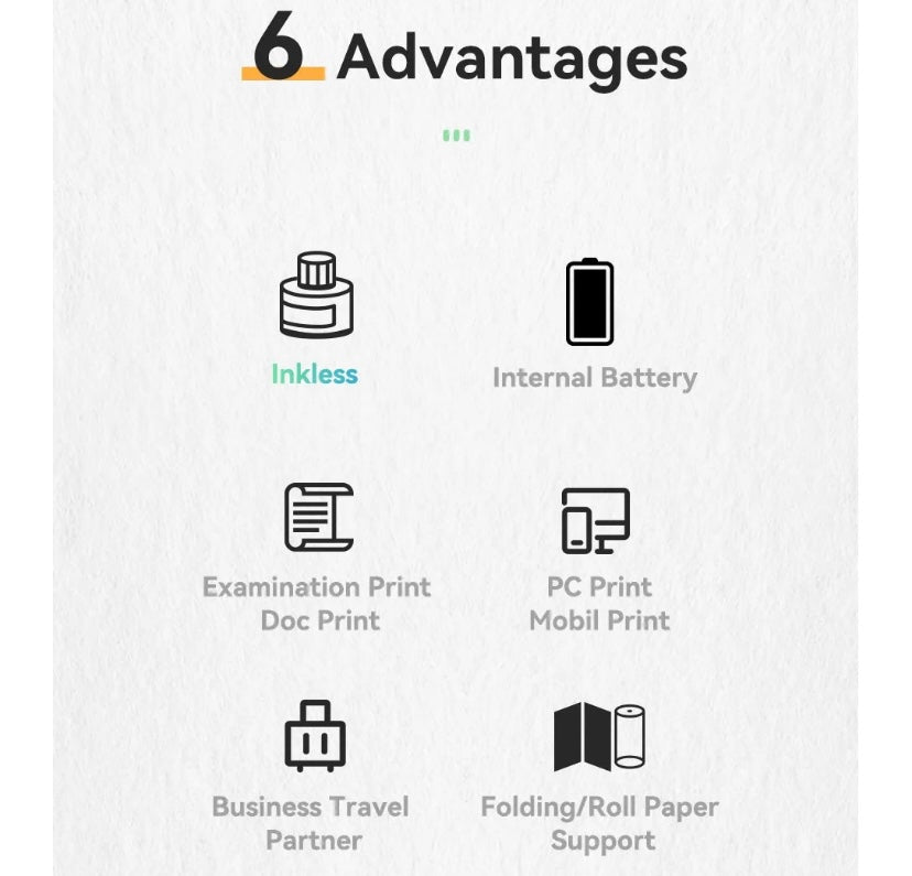 تستخدم طابعة PeriPage A40 تقنية الطباعة الحرارية لتوفير طباعة فائقة السرعة وبدون الحاجة إلى استخدام الحبر. تعمل ببطارية قابلة للشحن، مما يوفر لك حرية التنقل واستخدامها بدون الحاجة إلى توصيلها بمصدر طاقة خارجي.